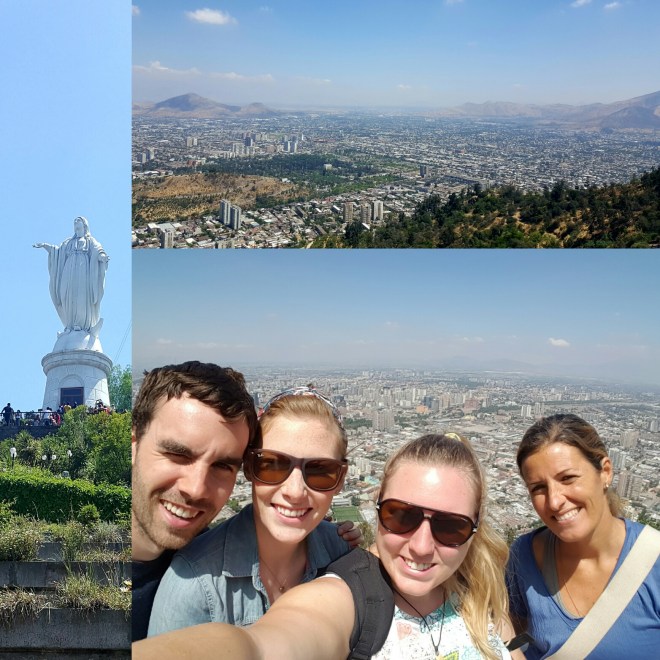 Das ist so ziemlich das größte Hostel hier, das ich je erlebt habe! Die haben ungelogen bestimmt 50 Zimmer und man kann sich hier auch mal verlaufen. Dementsprechend stressig läuft das Frühstück ab – zu ungemütlich und hektisch für mich. wir machen uns zu viert auf Richtung Cerro San Cristobal: ein Berg mit Marienstatue und Blick über die gesamte Stadt. Ich wäre ja hoch gelaufen, aber Caoimhin (Quivin gesprochen- diese irischen Namen…) humpelt übel also nehmen wir das Funicular – wir stehen so lange an, dass man zu Fuß bald genauso schnell gewesen wäre.