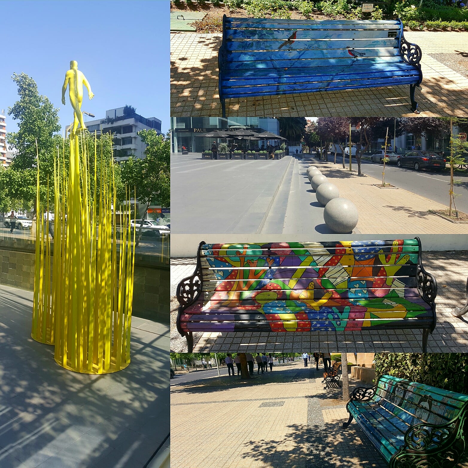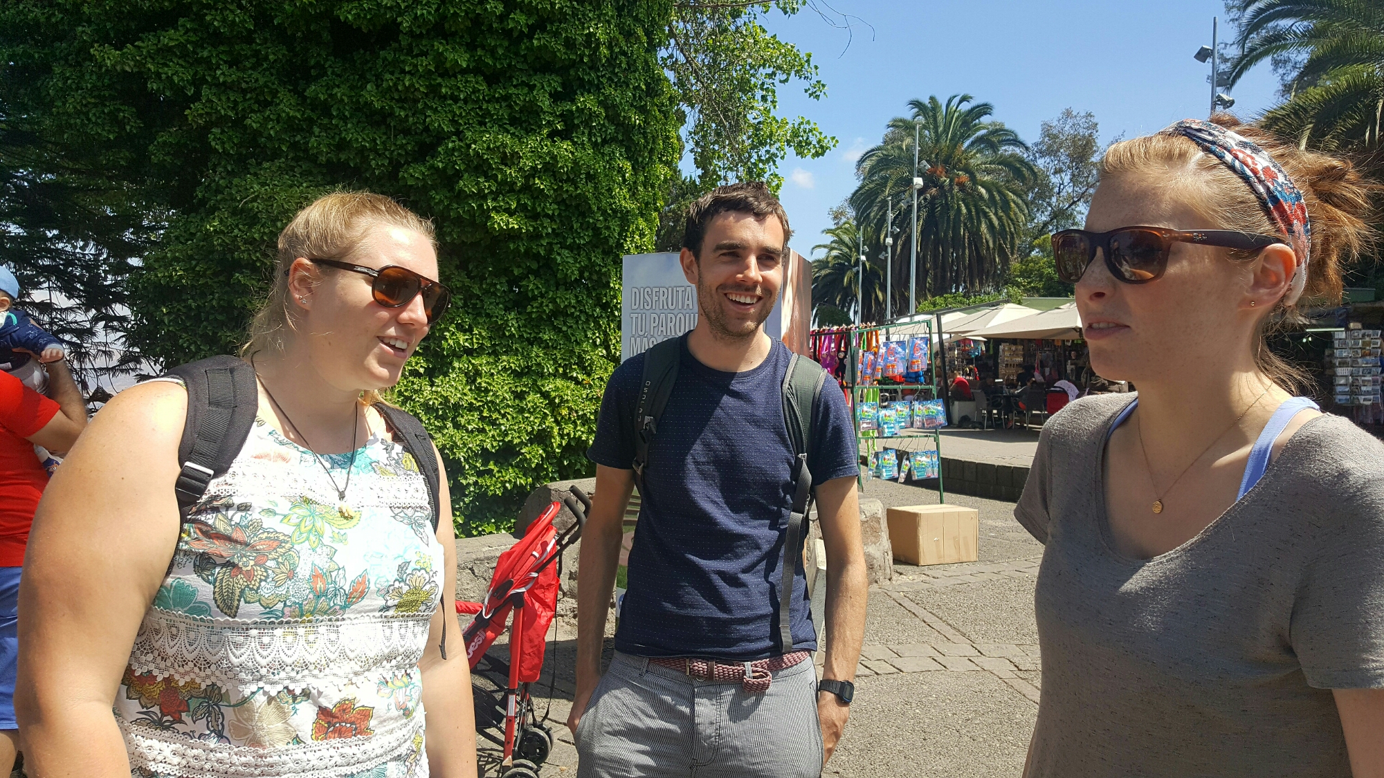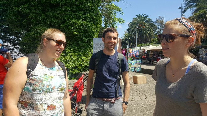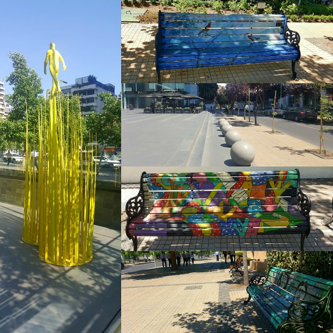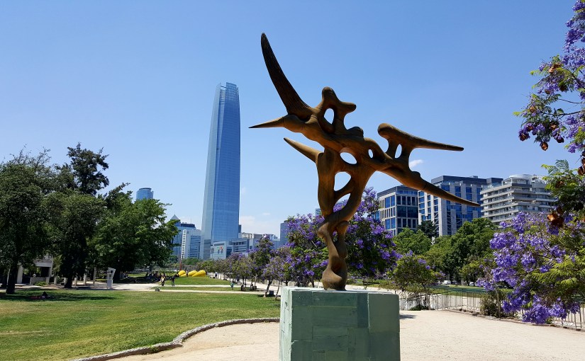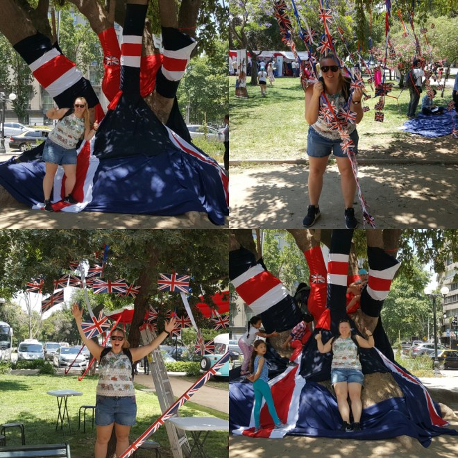 Wieder unten angekommen, ist die Schlange dreimal so lang. Caoimhin verabschiedet sich Richtung Hostel, da sein Fuß Ruhe braucht. Für die beiden gehts morgen außerdem weiter nach Neuseeland. Ich übernehme die Führung und wir spazieren durch das Lastarria Viertel und den Parque de las esculturas. Auf dem Weg kommen wir an einer Messe für Studieren im Ausland vorbei und Tiff ist ganz aus dem Häuschen, weil sie die britische Flagge sieht. Ich werde genötigt, sie mit allen Flaggen in jeglichen Positionen abzulichten. In dem Zusammenhang kommen wir darauf zu sprechen, dass der Bezug zur Nationalflagge bei uns Deutschen nach wie vor negativ besetzt ist.
