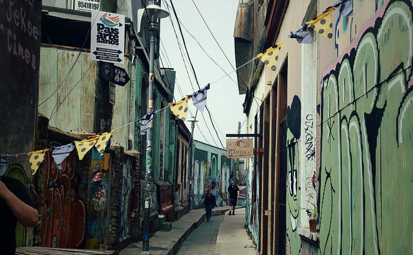 Nach dem emotionalen Tag gestern gehe ich in der Früh laufen bevor die Hitze die Stadt voll einnimmt. Tiff wartet schon in Valparaiso, da um drei mittags die Walking tour beginnt. Ich komme gerade rechtzeitig und ziemlich verschwitzt an, da das Hostel wie die meisten oben in den verwinkelten Gassen liegt und ich mal wieder lieber laufe als ein Taxi zu bezahlen oder auf den richtigen Bus zu warten. Allerdings lasse ich mittlerweile während dieser Läufe den neuen Ort bewusst auf mich wirken, was mich von meinem immernoch scheiß schweren Rucksack ablenkt.
