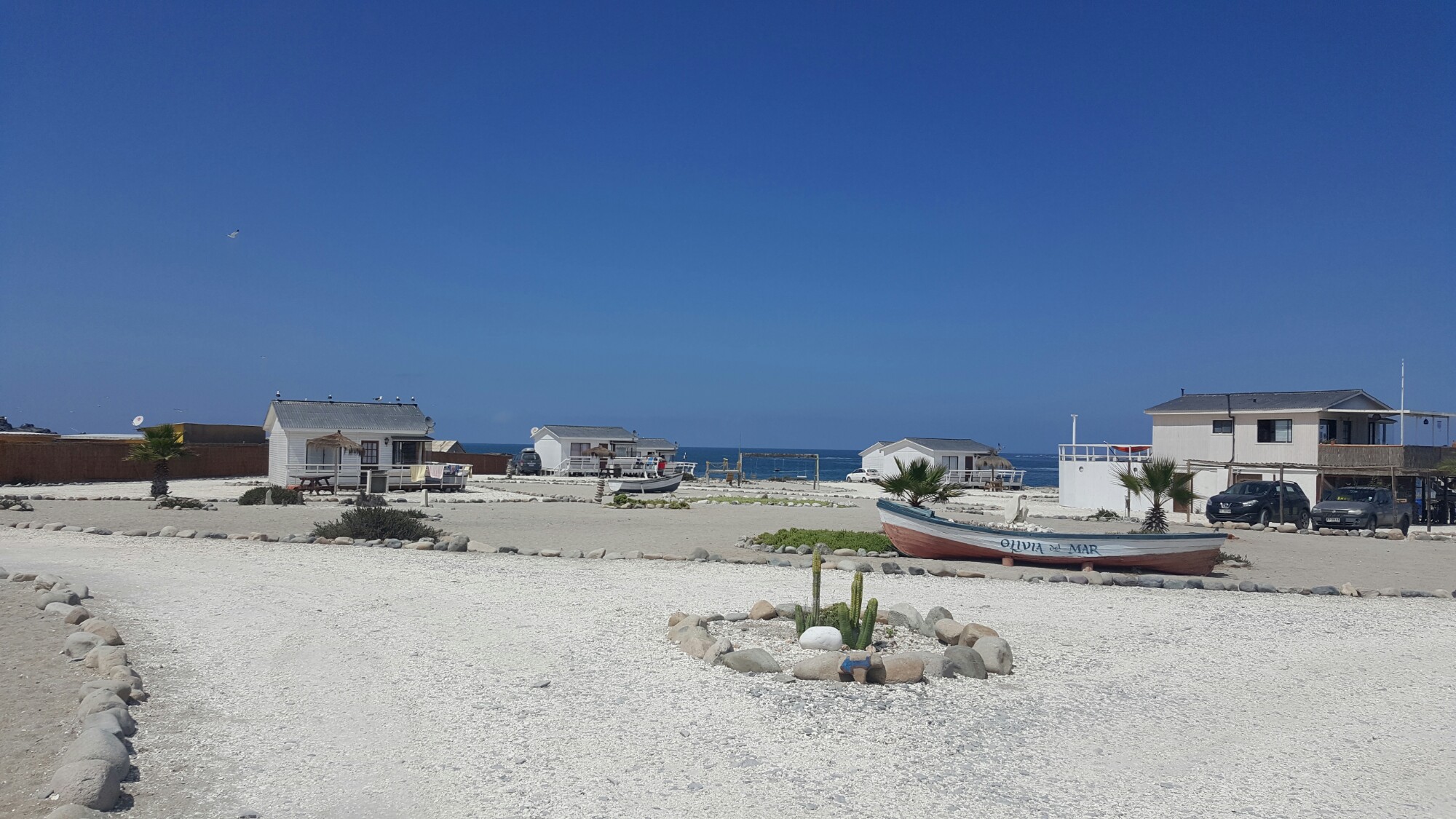 Lea-Lee und Quilla haben sich drei Nächte in einem Boot reserviert, ich schlafe im Backpacker-Zimmer, einfach aber sauber, ansonsten gibt es auf der Anlage noch ein paar Ferienhäuser und Zeltplätze. Unser direkter Blick aufs Meer erinnert mich an Szenerien aus der Traumschiffserie.