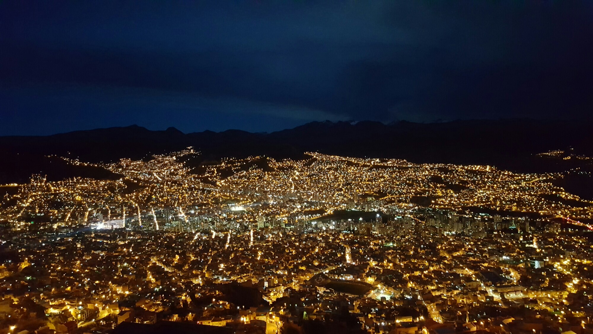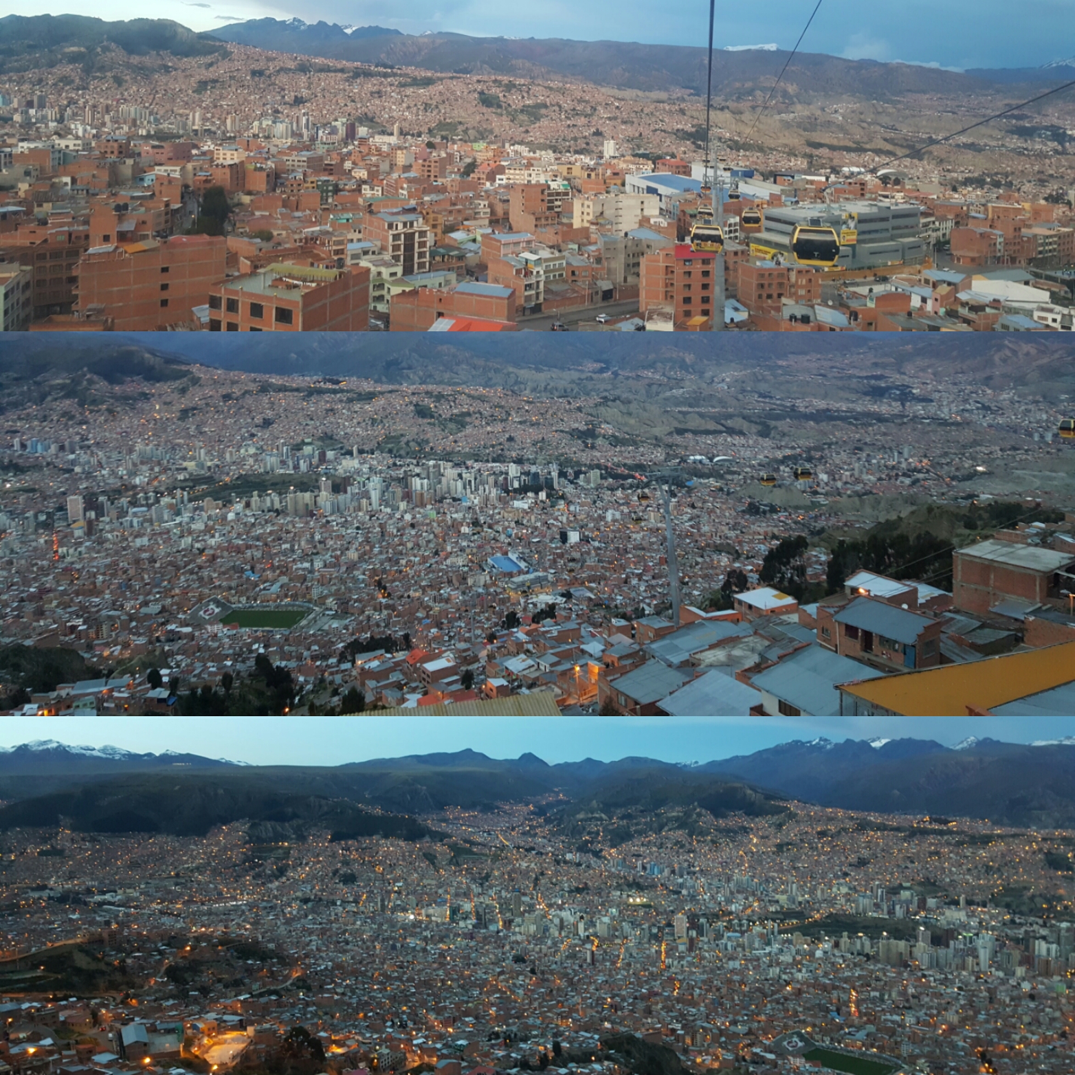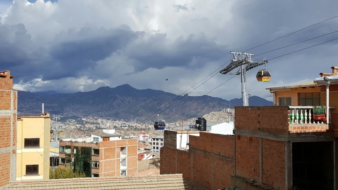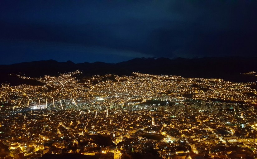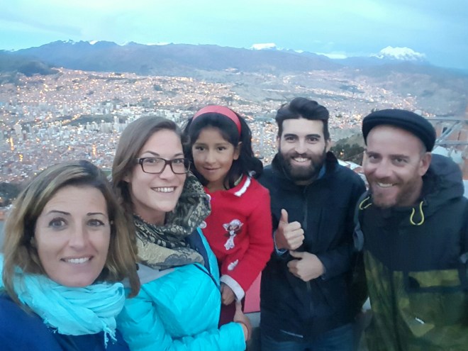Den Sonnenuntergang wollen wir uns heute von ‚El Alto‘ aus anschauen und laden Victor und Olivier ein uns zu begleiten. Mit dem Teleférico fahren wir hoch bis zur Endstation, finden dort aber keinen ausgemachten Aussichtspunkt. Wir laufen ein paar Schritte und entdecken eine Dachterrasse eines einfachen Wohnhauses. Debbie quatscht mal wieder die Einheimischen an und fragt, ob wir hoch dürfen: der Besitzer mit einem kleinen Kiosk hat nichts einzuwenden, seine kleine Tochter führt uns die Stufen hinauf und so blicken wir kurz darauf vom gefühlt allerbesten Ort ins Tal der Megastadt La Paz. Als die Sonne sich langsam verabschiedet und die vielen kleinen Lichter der Stadt erleuchten, stoßen wir an mit Bier und sind fasziniert vom Lichtermeer und wie sich einzelne Straßen bis tief in die Berge ziehen. Zurück im Hostel kochen wir mit den Jungs Seite an Seite und lassen den Abend gemeinsam ausklingen.