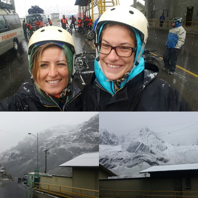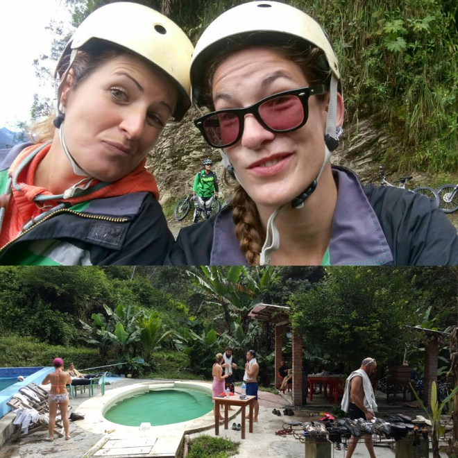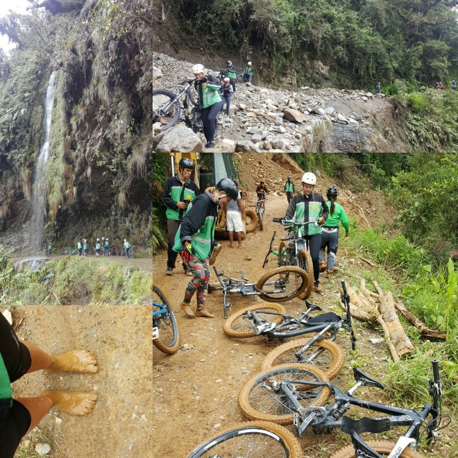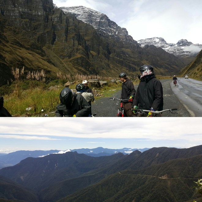 Um sieben Uhr morgens bringt uns ein Taxi zum Treffpunkt für die Biketour. Die Deathroad soll die gefährlichste weltweit sein und tatsächlich gibt es immer wieder Unfälle, die ganz selten sogar tödlich enden; dementsprechend nervös ist der eine oder andere. Im Kleinbus werden wir auf 4000 Meter Höhe gebracht, wo uns Schnee und Eiseskälte begrüßen. Wir bekommen unsere Ausrüstung und individuell zugewiesene Mountainbikes. Innerhalb von Minuten schmerzen meine Hände – kaaaaalt! Doch dann gehts los: die Strecke beginnt mit 16km Asphalt, gefolgt von Schotterwegen, mal mehr mal weniger breit, die serpentinenförmig durch die Berge führen. Nach den ersten Kilometern verschwindet der Schnee und der Himmel klart auf. Durch die fast 3000 Höhenmeter, die es insgesamt bergab geht, durchfahren wir verschiedenste Vegetationen und Wärmegrade, müssen kleine Flussläufe überwinden und bekommen Abkühlung von Wasserfällen, die unseren Weg kreuzen. Ein Erdrutsch vom Vortag zwingt uns ganz abenteuerlich durch knöchelhohen Schlamm. Debbie amüsiert sich köstlich, wie ich barfuß pfiensend durch den Schlamm stolpere, da mir bei jedem Schritt Steine in die Fußsohlen stechen. Ich bin ja hart im nehmen, aber meine Füße sind sensibel wie die Prinzessin auf der Erbse!