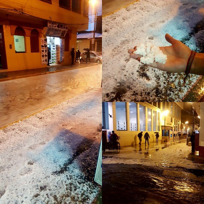 Ankunft in Puno: Endlich etwas wärmer hier! Das Hostel ist nur 1,6km weit, laufen wir natürlich. Super freundlich werden wir an der Rezeption begrüßt und ich bin begeistert von unserem Zimmer: keine Stockbetten, Viererzimmer und viel Platz. Sein Tagen wollen wir unsere Sachen waschen lassen und tragen unsere letzte Unterwäsche, Debbie musste schon von Hand waschen; gegen Abend suchen wir also die nächste Lavandería auf, wollen nur kurz unsere Sachen abgeben und danach gleich weiter, Hunger stillen. Der Himmel sieht verdächtig dunkel aus und wir hören schon das Donnern. Auf dem Weg fallen die ersten Regentropfen und kaum dort angekommen, gehts los: es schüttet von jetzt auf gleich in Strömen, keine fünf Minuten später der erste Hagel. Ungläubig schaue ich Debbie an und wir müssen beide lachen. Die Straßen verwandeln sich in Bäche, die Gehwege werden komplett weiß, bedeckt von einer Hagelschicht. Über eine Stunde warten wir in der Wäscherei, beobachten amüsiert, wie Passanten stehenbleiben, zögern, auf die andere Seite blicken, insgeheim hoffen, irgendwie trockene Füße zu behalten, drei große Schritte durchs Nass und keine Chance, alles durchnässt. Letztendlich hilft alles nichts, wir stürzen uns ins Getümmel und barfuß gelangen wir mit trockenen Schuhen und Socken in der Hand auf die andere Seite – die Kälte sticht in die Fußsohlen, ich lache und schreie zugleich.