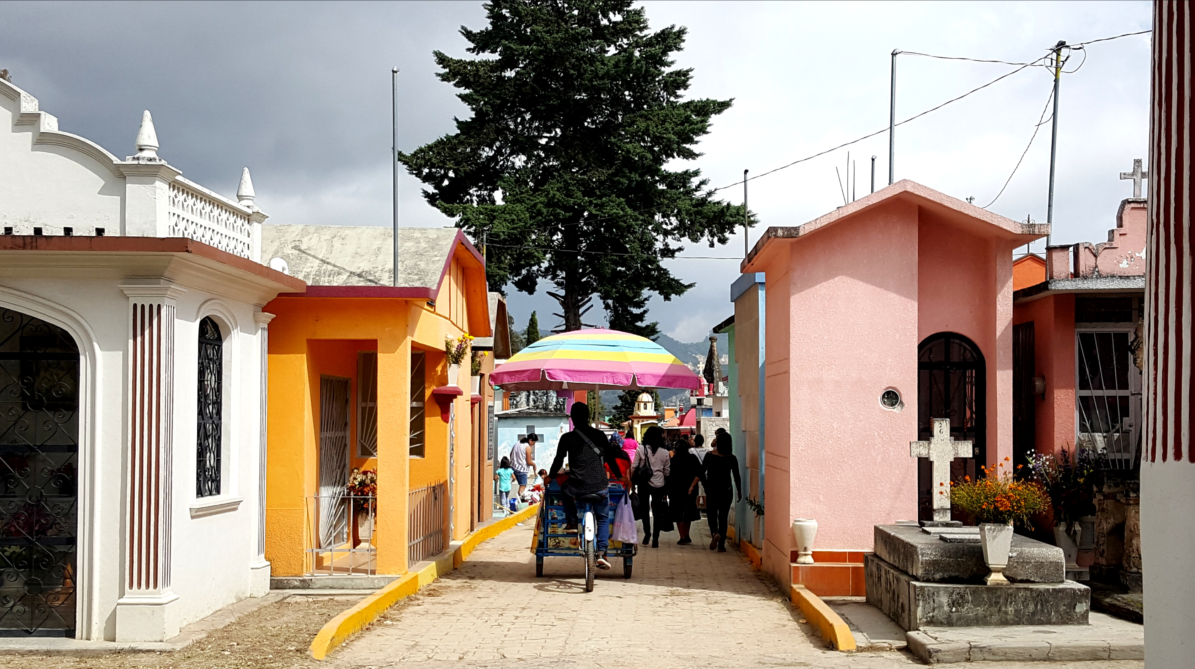 Am Nachmittag fahren wir anlässlich des „dia de los muertos“ zum Friedhof: traditionell wird der Totentag hier groß und bunt gefeiert, was für uns aus dem Westen sehr befremdlich sein mag, aber eigentlich von viel mehr Akzeptanz gegenüber dem Kreislauf des Lebens zeugt und mit positiven Gedanken und heiterer Stimmung an die Verstorbenen erinnert wird. Der Friedhof selbst wirkt wie eine kleine Stadt und nicht ganz so bunt aber ähnlich kenne ich das aus Buenos Aires. Wir beobachten Menschen, die beim Essen zusammensitzen, lachen, es gibt Musik und Straßenverkäufer. An die Totenköpfe überall gewöhnt man sich übrigens schnell und sie sind jetzt für mich wesentlich positiver konnotiert als zuvor.