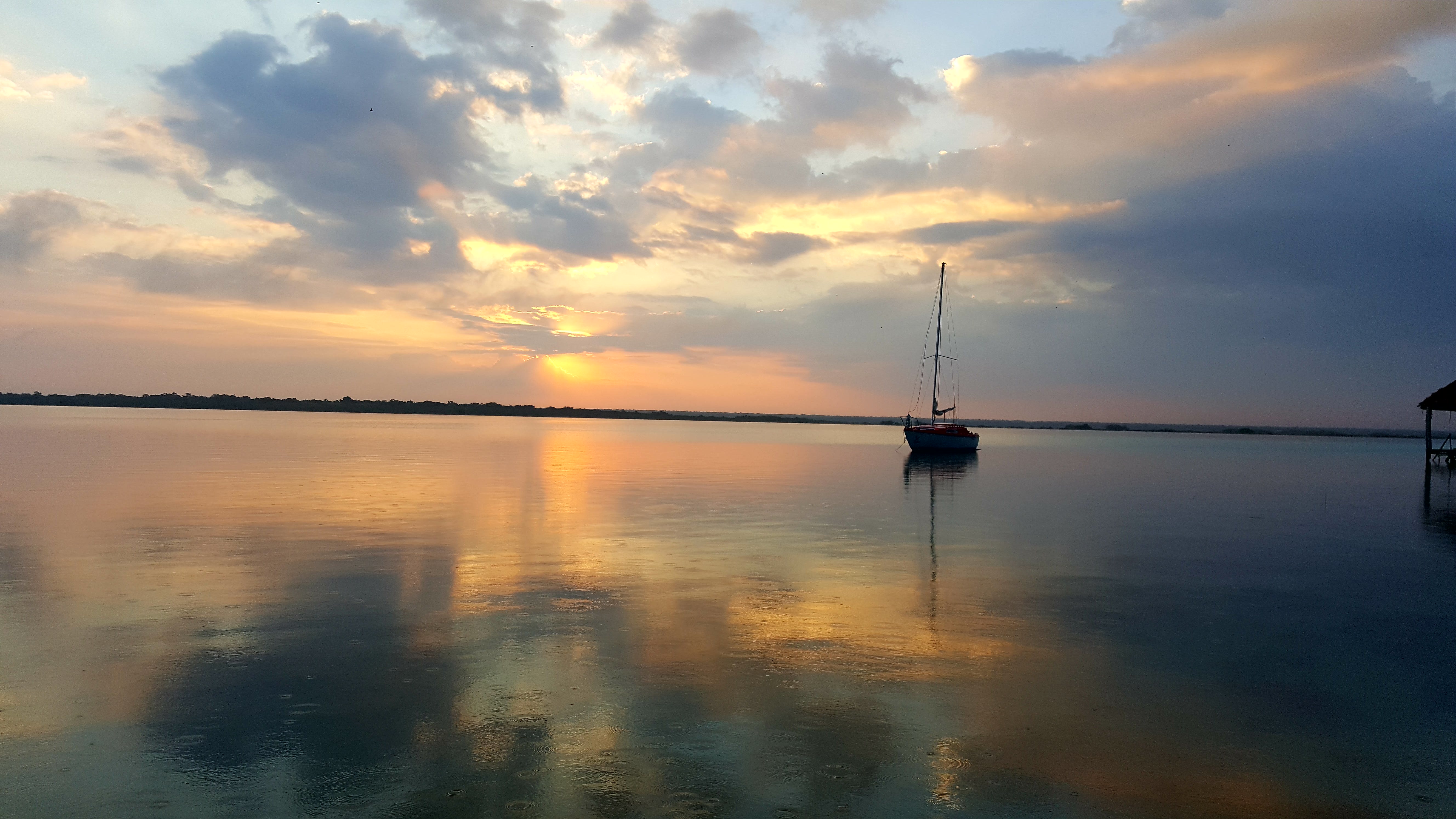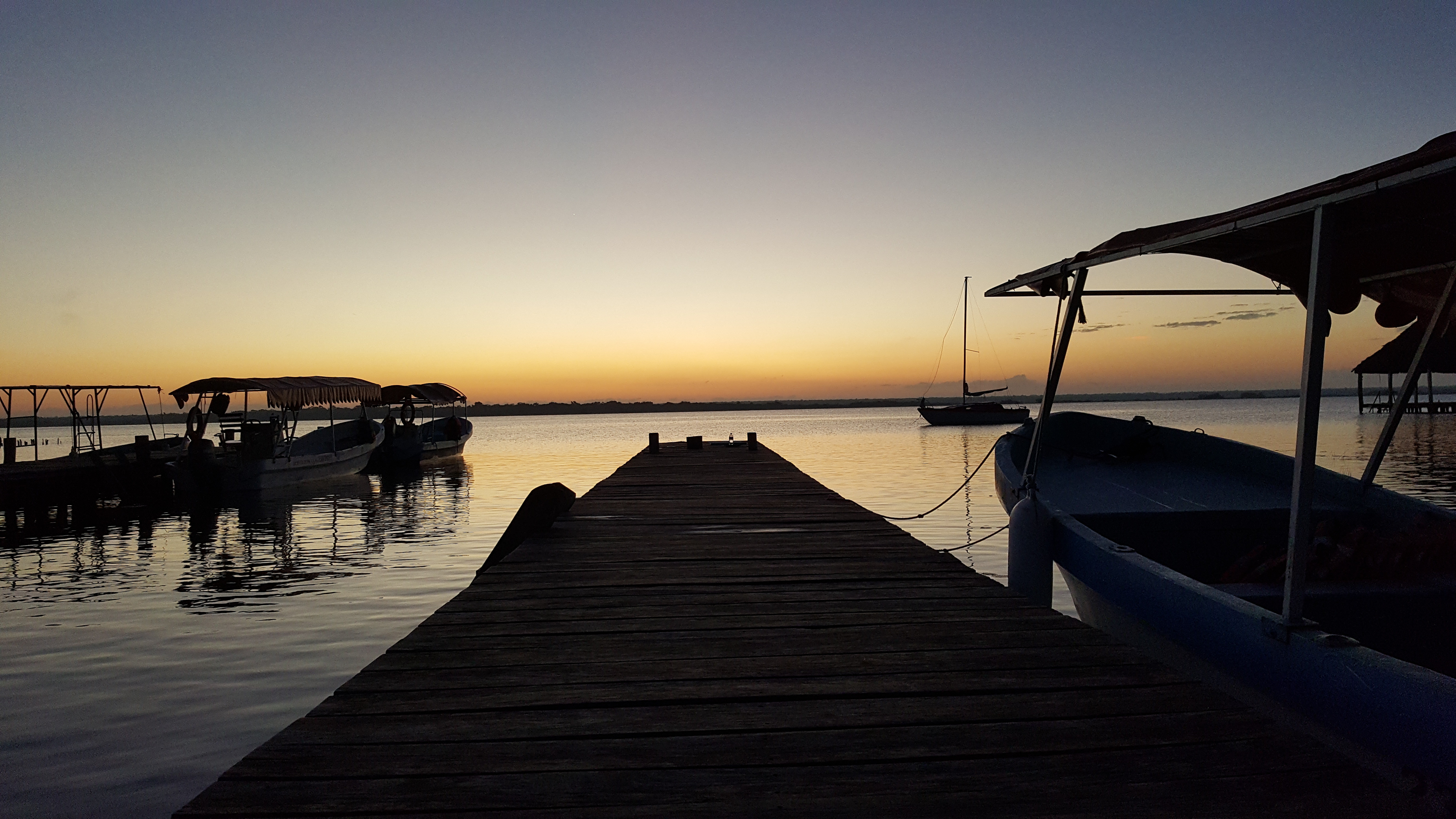 Mein Nachtbus erreicht um halbdrei Uhr morgens das kleine Dorf Bacalar. Ich laufe durch die stille Nacht Richtung Hostel Yak Lake, welches direkt am See liegt. Im Vorfeld hatte ich angefragt, ob ich mitten in der Nacht aufkreuzen kann, worauf ich die Antwort bekam, vor sechs Uhr eine weitere Nacht buchen zu müssen, was ich gar nicht einsehe. An der Straße am See finde ich ein paar Parkbänke und entscheide kurzerhand, hier zu warten. Der Ort wirkt friedlich und sicher, ich krame meine Stulpen aus Bolivien, Kaputzenpullover, Schal und mp3-Player aus meinem Hab und Gut, bette meinen Kopf auf meinem kleinen Rucksack und blicke in einen klaren Sternenhimmel – mit Musik im Ohr schwebt mein Geist in einen leichten Schlaf. Kurz vor sechs packe ich meine Sachen und laufe die letzten Meter zum Hostel, wo ich als allererstes ein großes einladendes Sofa erblicke, auf dem ich die letzten Stunden genausogut hätte verbringen können, was mir später einer der mexikanischen Angestellten bestätigt, der mich auf der Parkbank liegen sah. Die Lage direkt am See ist ein Traum, mit der Terrasse, dem Steg ins Wasser und der hochwertigen Einrichtung wundert es mich nicht, dass der Preis pro Nacht über dem Durchschnitt liegt.