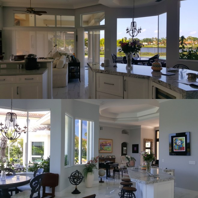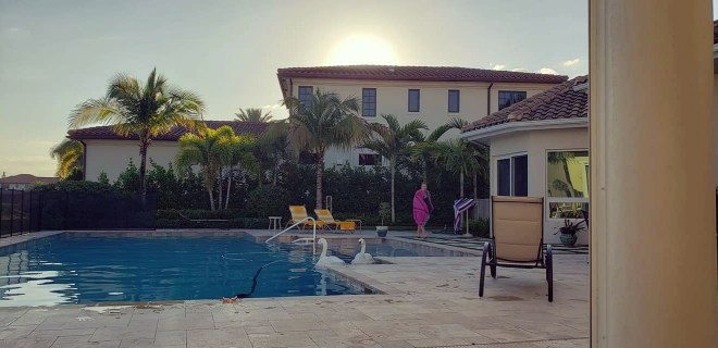 Orlando ist nicht der näheste Flughafen, doch Fred besteht darauf, dass wir direkt fliegen und holt uns in seinem Bentley vom Flughafen ab. Ca zwei Stunden dauert die Fahrt nach Jupiter. Er wohnt hier in einer sogenannten gated community – eine bewachte Anlage mit mehreren Golfplätzen. Alles sehr nobel, weitläufig, überall schicke Autos, Golfcarts. Sein Haus liegt direkt am Binnenkanal (intercostal).