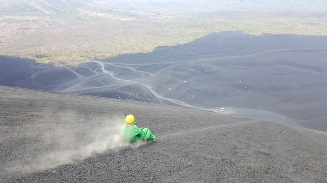 Der Aufstieg geht relativ schnell. Oben angekommen, bekomme ich eine Art Schutzausrüstung gegen Asche und kleine Steine, kurze Einweisung und wie auf einem Schlitten geht’s den Berg hinunter.