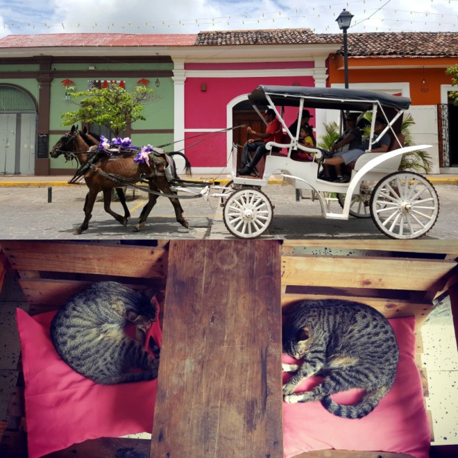 Dann die Busfahrt zurück, welche wir aber bei Tag unternehmen, es gibt viel zu sehen und wir stellen sicher, dass wir nicht auf den Kacksitzen landen. Ali und Andy begleiten uns nach Granada, obwohl sie schon dort waren. Sie wollen Vorräte auffüllen (Zigaretten, Rum etc.) Ich überlege, mit den beiden weiter nach Ometepe zu reisen, denn ich genieße ihre Gesellschaft.