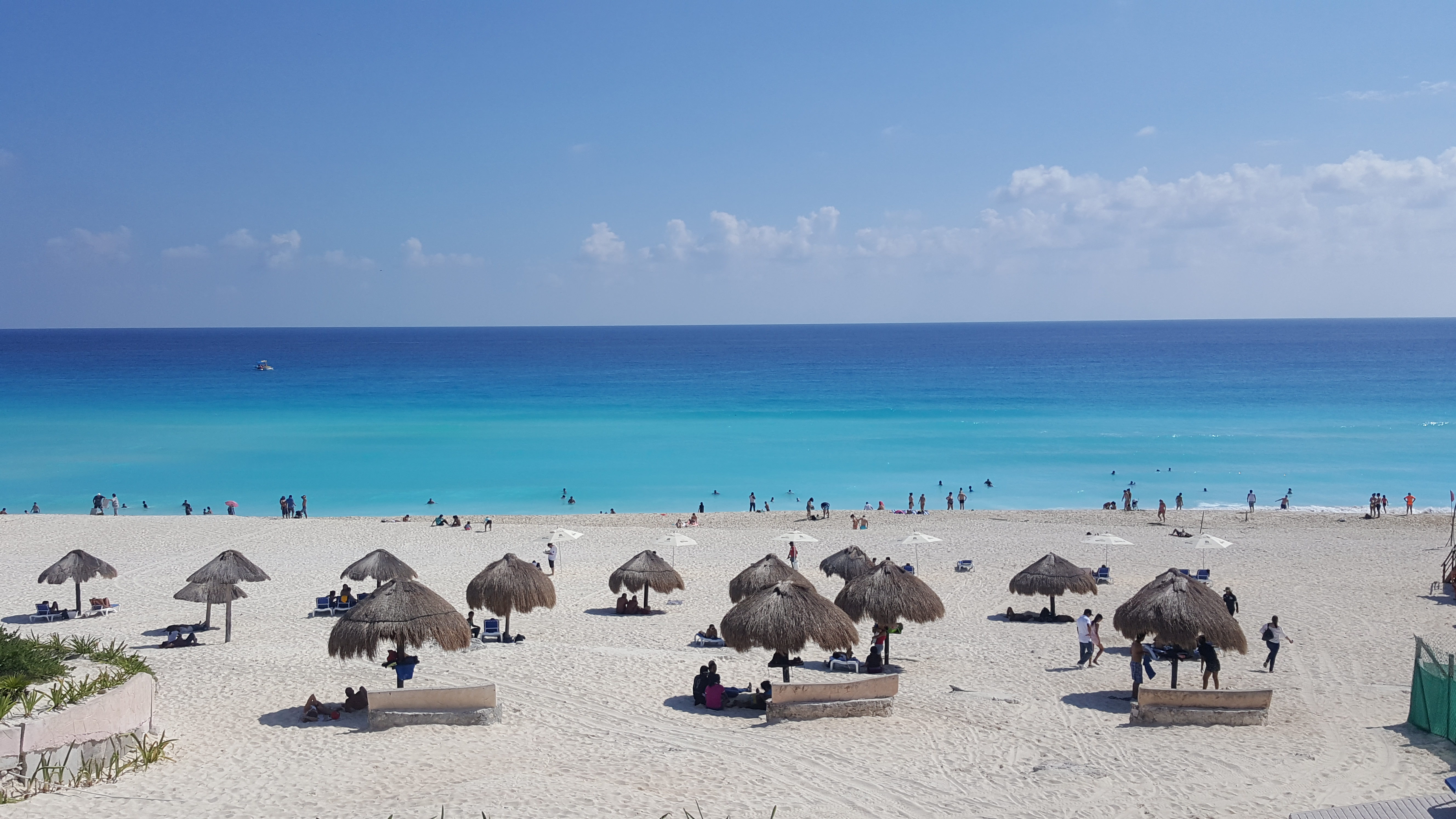 William empfiehlt mir den Strand Playa de Delfines, mit dem Bus kommt man da ganz einfach hin; mach ich doch direkt. Ungefähr fünfundzwanzig Minuten dauert es, bis das Colectivo die komplette Hotelpromenade abgefahren ist; ich steige aus, überquere die Straße und schaue aufs Meer – nein, ich starre aufs Meer! Die Farben sind unglaublich! Ich brauche ein paar Minuten um zu realisieren, dass das, was ich hier vor mir sehe, wirklich echt ist: kein Farbfilter, keine Bearbeitung, kein Fake – die Blautöne des Wassers fesseln meinen Blick.