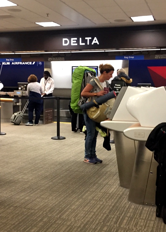 Don bringt uns zum Flughafen, wo dieses Bild zustande kommt und mich in typischer Pose in all diesen Monaten zeigt; meinen Rucksack nenne ich auch liebevoll ‚mein Haus‘. Wenn ich sie auch ab und zu schief anblicke, weil sie von allem und jedem Fotos schießt, muss ich Robyn schon rechtgeben, dass ich dankbar für die vielen Bilder bin.