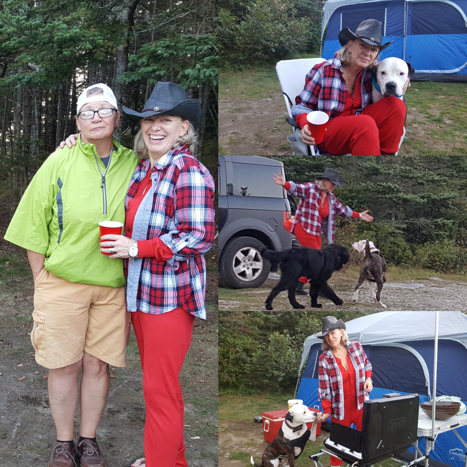 Trish und Sherry; Sherry im Campingoutfit und beim Tanz mit den Hunden