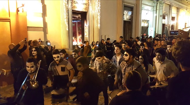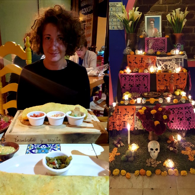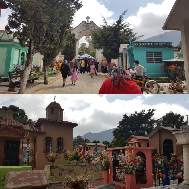 Am Nachmittag fahren wir anlässlich des „dia de los muertos“ zum Friedhof: traditionell wird der Totentag hier groß und bunt gefeiert, was für uns aus dem Westen sehr befremdlich sein mag, aber eigentlich von viel mehr Akzeptanz gegenüber dem Kreislauf des Lebens zeugt und mit positiven Gedanken und heiterer Stimmung an die Verstorbenen erinnert wird. Der Friedhof selbst wirkt wie eine kleine Stadt und nicht ganz so bunt aber ähnlich kenne ich das aus Buenos Aires. Wir beobachten Menschen, die beim Essen zusammensitzen, lachen, es gibt Musik und Straßenverkäufer. An die Totenköpfe überall gewöhnt man sich übrigens schnell und sie sind jetzt für mich wesentlich positiver konnotiert als zuvor.
