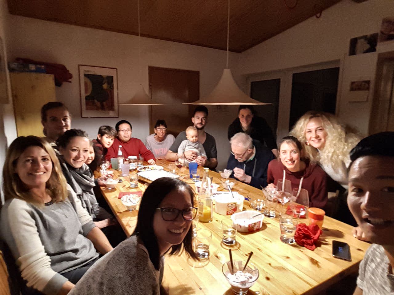 Wir sind früher zurück als Mama uns erwartet hat und das Essen ist noch nicht fertig, was aber gar nicht schlimm ist: wer will, bekommt ein Glas Wein von mir in die Hand, wir quatschen, albern rum, und genießen es einfach zusammen zu sein. Heute sind wir siebzehn Personen. Neben dem großen Kern sind noch Diemy’s Schwester und Mann zum Essen da, Mama hat mal wieder noch mehr Leute eingeladen: Hamada, der Mitbewohner unseres Bruders Manuel, ein Syrer, der schon richtig gut Deutsch kann und hier Sport studieren will und Lamin aus Ghana, dem Mama geholfen hat Deutsch zu lernen und der immernoch regelmäßig vorbeikommt. Er taucht letztendlich erst am zweiten Feiertag auf, hat den Bus verpasst. Ich amüsiere mich, als Mama mit Ellen eine Sitzordnung festlegt, die wir eigentlich sonst nie haben: Mama: „der Intelligente (wir kennen den Namen zunächst nicht) sitzt neben Sarah.“ Ich nehme das mal auf mehreren Ebenen als Kompliment.