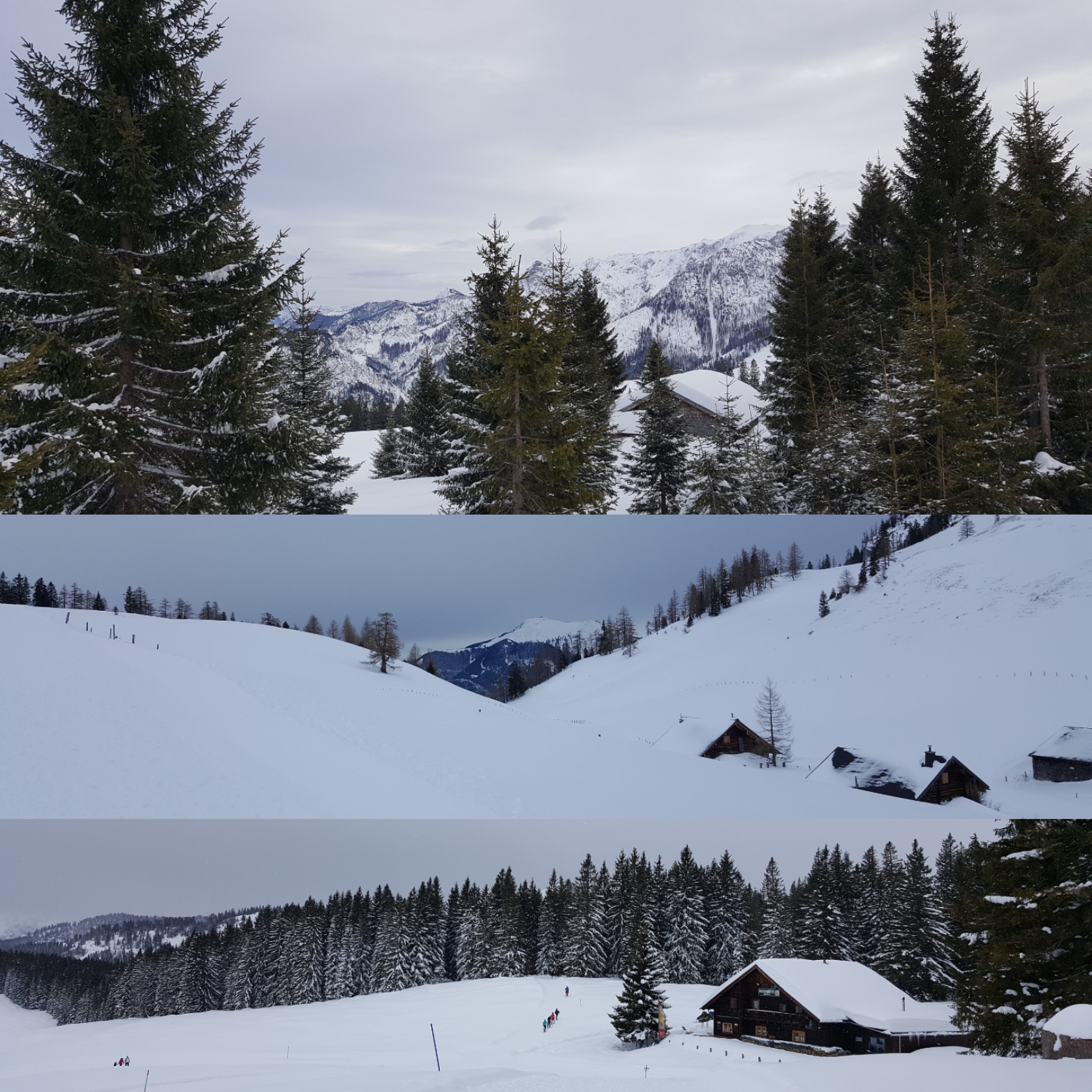Auf halbem Weg kehren wir ein in die Huberhütte: Flädlesuppe, Bauernkrapfen, Skiwasser und Glühmost. Dann bei Schneegestöber zurück zum Auto, halb durchgefroren zur Wellnessalm Leopoldhof: Kräutersauna, Ruheraum mit Wasserbetten, Pool, Schwebeliegen – was braucht man mehr.