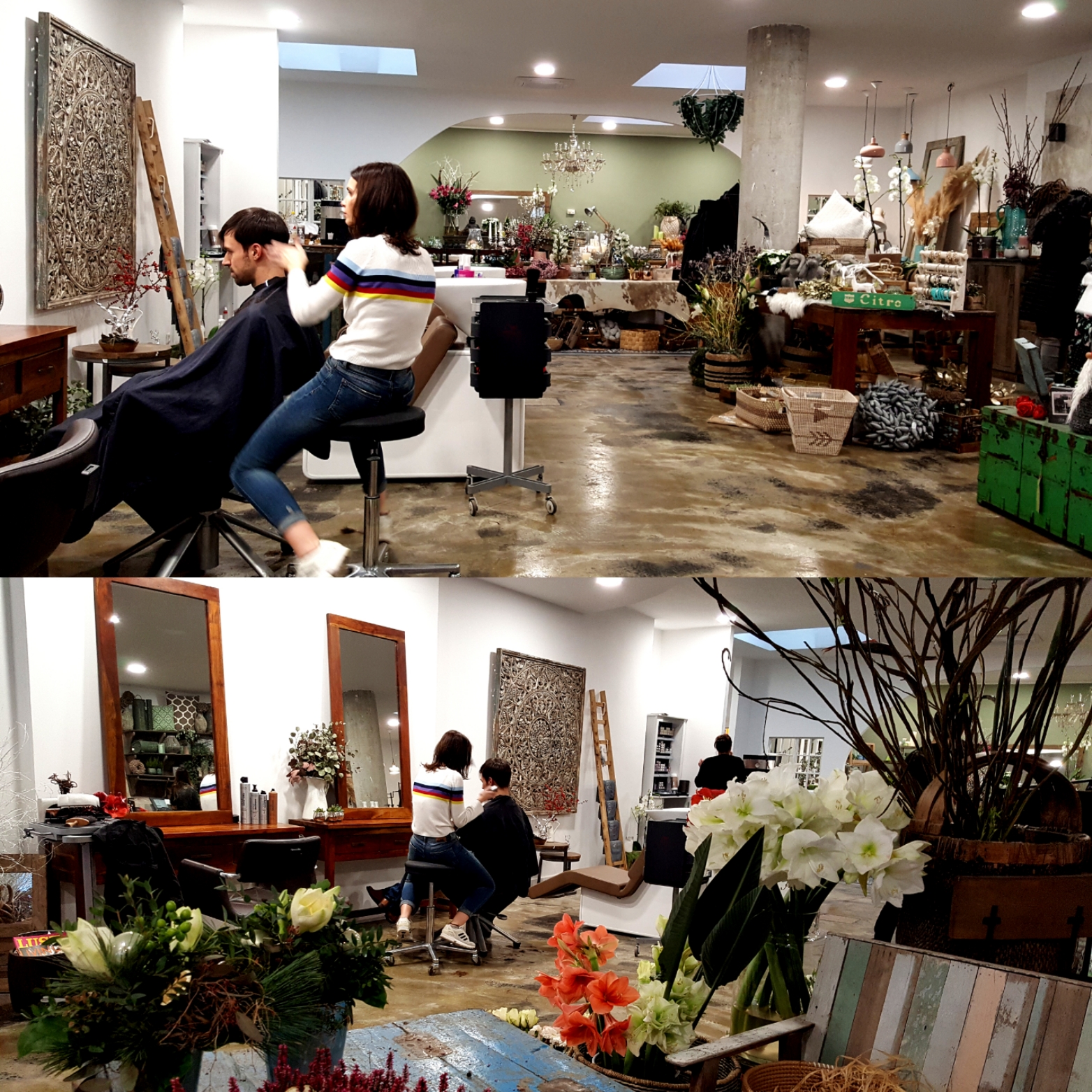 Noch ein Tag bis Weihnachten! Nach einem gemütlichen Frühstück mit Vera, Rainer und Paul fahre ich mit Vera noch kurz nach Mannheim in die Stadt, um ein paar Kleinigkeiten zu erledigen. Wir laufen über den Markt mit der Ausschau nach ein paar schönen Blumen, sind aber spät dran, also ist die Auswahl begrenzt. Vera kennt noch einen Blumenladen in der Nähe der Fressgasse. Das Konzept dort ist interessant und mittlerweile öfter anzutreffen: zwei Serviceanbieter in einem, hier Blumenladen kombiniert mit Friseur.